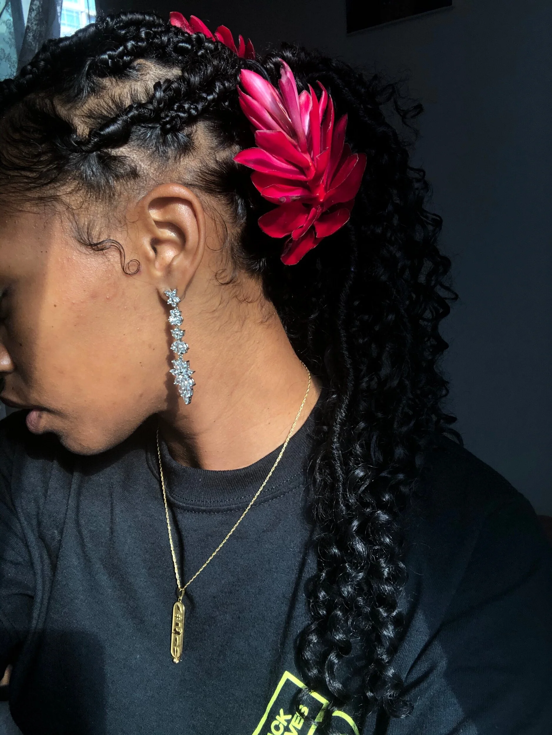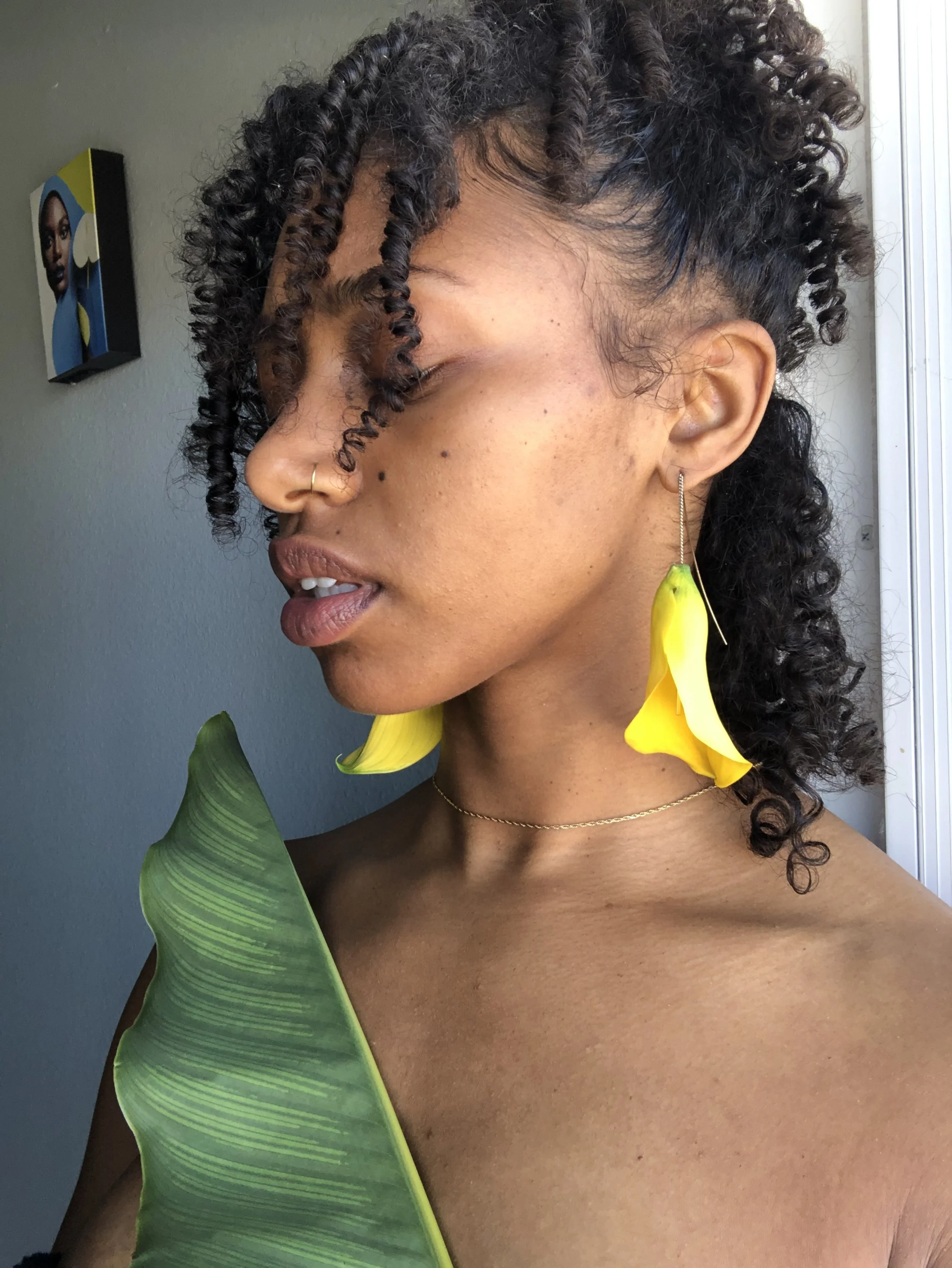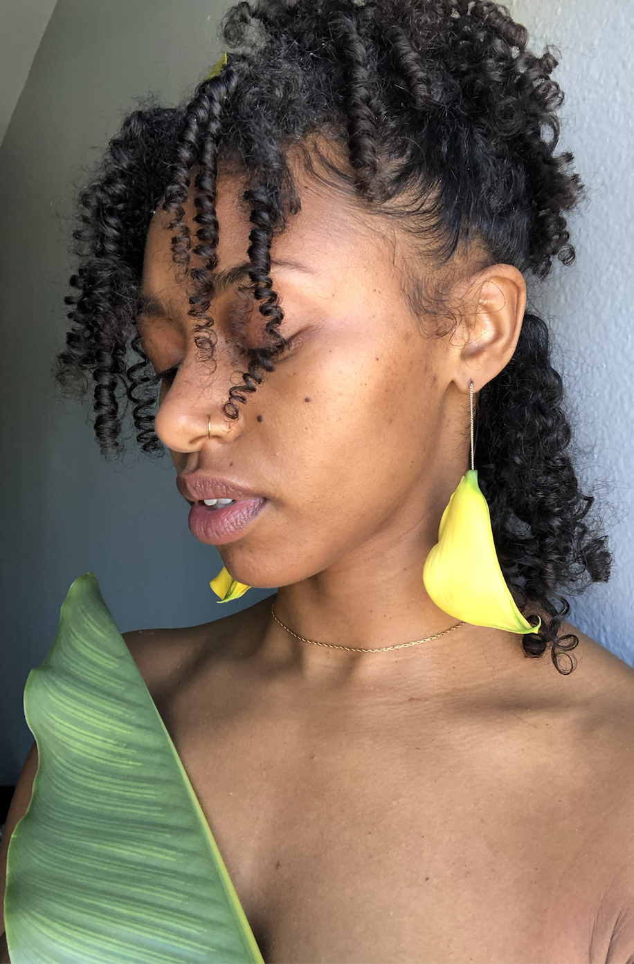 Earthly embellishments. Stacked Succulent Necklace Layered necklace made with String of Pearls. Palm Ear Cuff Craspedia Hair Accessories Calla Lilydrop Earrings Celosia Drop Earrings Red Ginger Scrunchie